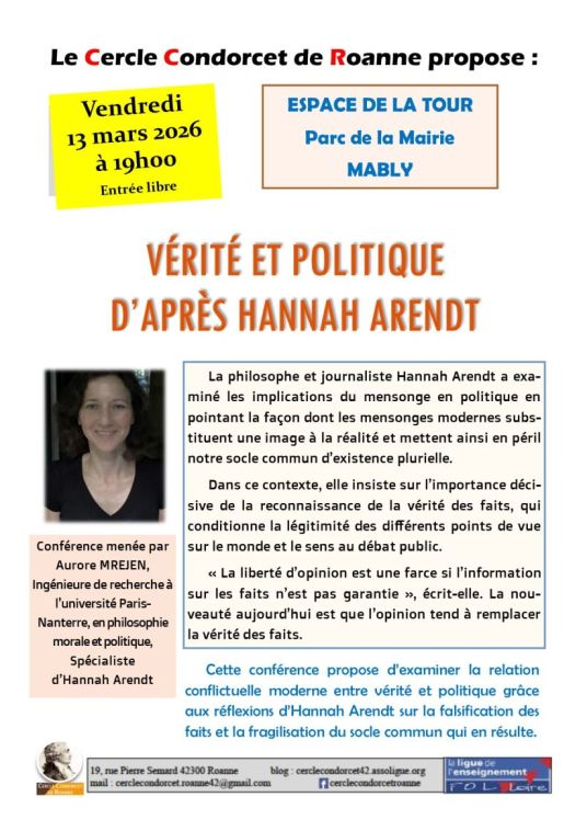 Conférence Cercle Condorcet de Roanne « Vérité et politique d’après Hannah ARENDT», le 13 mars 2026 à 19h