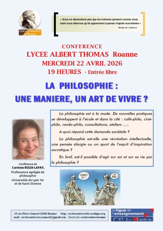 Conférence Cercle Condorcet à Roanne « La Philosophie: une manière, un art de vivre? » le 22 avril 2026 à 19h